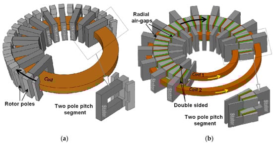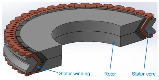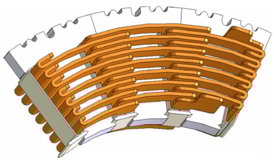 AM enables the fabrication of non-conventional windings proposed for EMs of any level of complexity [,]. As a potential example, Figure 4 presents a special, radially displaced segmented laminated winding proposed by Reinap, A. in [].