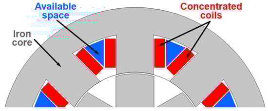 The optimal design of the windings for the EMs can significantly contribute to the improvement of their performances. By using low electrical resistivity materials, the Joule (copper) losses can be reduced. By achieving a high slot filling factor, the iron core volume can be diminished [], and thus also the iron core losses []. An adequate winding design can decrease the air-gap magnetomotive force (MMF) harmonics, too.