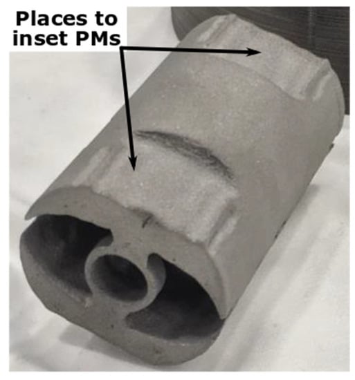 PM EMs are potential candidates for a wide range of industrial and automotive applications, mainly due to their high efficiency and specific power density. For such EMs, both cheap low- and more expensive high-energy density PMs are required to be integrated into the iron cores. Commonly, PMs are produced by means of sintering or bonding. Both technologies are complicated and time-consuming. Therefore, in this case, AM can also bring a significant advance in EM manufacturing [].