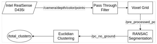 The method consists of an ROS (robot operating system) node that subscribes to the point cloud provided directly by the depth camera in the “camera/depth/color/points” ROS topic. Some intermediate topics are also published for algorithm visualization. These topics include the “pre_processed_pc” topic for the down-sampled and range-limited point cloud and the “pc_no_ground” topic for the point cloud after removal of the ground plane.