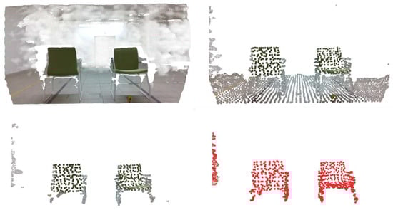 Indoor results for the four stages of processing. From top-left to bottom-right: original point cloud, down-sampled and range-limited point cloud, point cloud after ground plane removal and point cloud with detected clusters (two chairs).