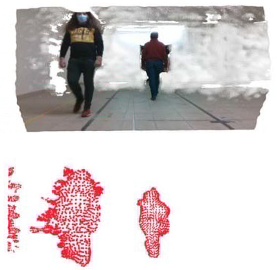 Moving obstacle detection (pedestrians walking in opposite directions). In this test, the AGV was stationary. (Top): original point cloud; (Bottom): detected clusters.