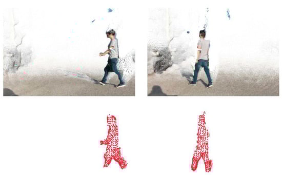 Moving obstacle detection (wandering pedestrian). In this test, both the person and the AGV were moving. (Top): original point clouds; (Bottom): detected clusters.