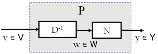 By appling an intermediate variable w ∈ W, W is called a quasi-state space of P and the input and output of the operator P are described as y = N(w) and v = D(w), respectively. If D is invertible, w(t) = D(v)(t), then P(v(t)) = N(w(t)) = ND(v)(t); if, furthermore, N and D are two stable operators, the operator P is said to have a right factorization, as shown in Figure 1.