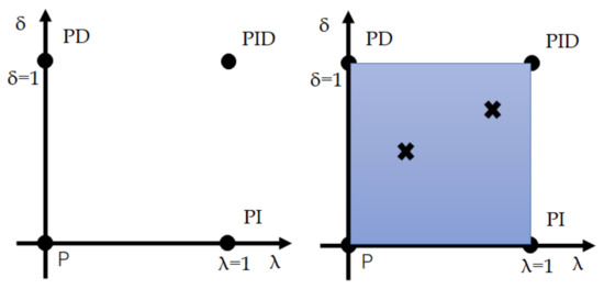 If , it is a conventional PID control. It is obvious that the fractional order controller needs to design the three parameters , , and as well as the orders , of the integral and derivative controllers. The orders , need not necessarily be integers, and can be any real numbers. As shown in Figure 5, the FOPID (fractional order PID) controller generalizes the conventional integer order PID controller and expands it from point to plane. This expansion can provide a great deal more flexibility in PID control design.