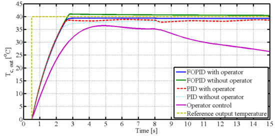 As a spiral heat exchanger is a nonlinear system with uncertainties, disturbances, and a long delay time, it is difficult to improve the tracking performance of the output temperature. While operator-based control is a nonlinear control method to improve stability, tracking performance remains poor. PID feedback control is widely used in application due to its simple form and because it only required three parameters to be adjusted. FOPID, with its five parameters, is an extension of conventional PID. Thus, FOPID is more flexible than the conventional PID. The five cases for output temperature control of the presented spiral heat exchanger were designed to compare tracking performance and stablity for uncertanities and disturbance, as shown Figure 6, Figure 7, Figure 8, Figure 9 and Figure 10.