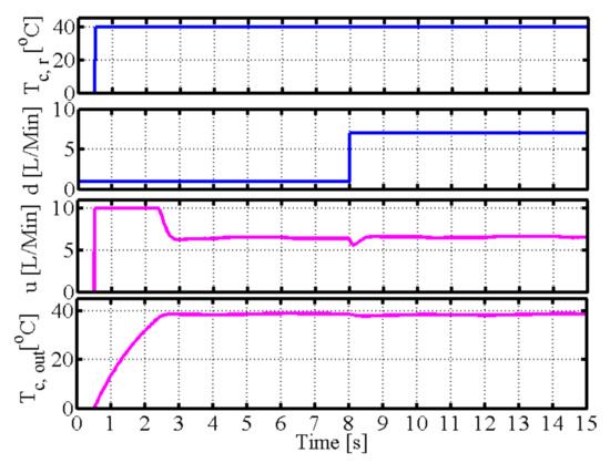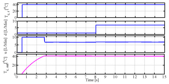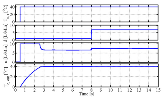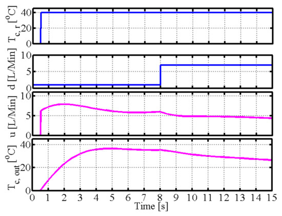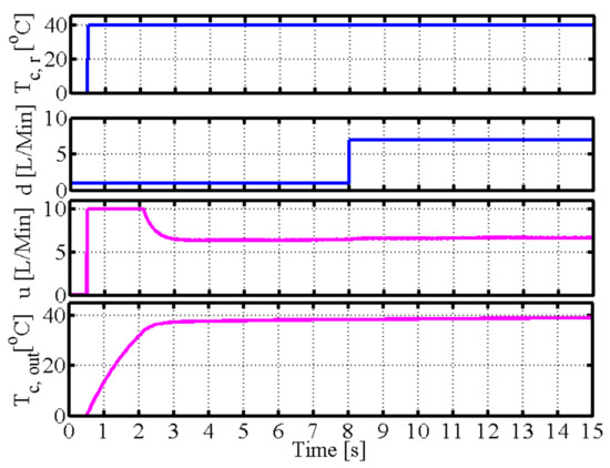 Here, Table 1 shows the simulation parameters for the spiral-plate heat exchanger. Table 2 denotes the simulation condition for the spiral-plate heat exchanger. The reference output temperature is the output temperature of the cold fluid. The volume flow rate on the cold fluid side is the disturbance signal; is changed from 1 L/Min to 7 L/Min in time 8 s, and are the uncertainties of the spiral heat exchanger’s shape and the heat transfer coefficient, respectively. The volume flow rate on the hot fluid side is the control signal. Considering the actual condition, the maximum input volume flow rate is 10 L/Min.