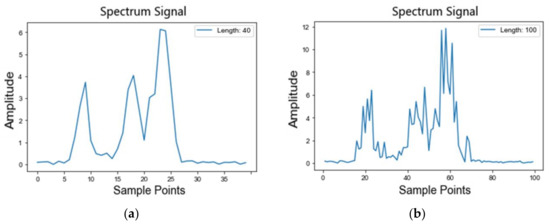 The original frequency-domain signal diagrams of the imbalanced dataset E at 40, 100, and 200 scales are shown in Figure 8a–c, respectively. Take dataset E, for example: the multi-scale unbalanced fault samples with an imbalance ratio of 0.1 in E are iteratively trained by the gradually growing multi-scale generation model (MS-PGAN). When the training reaches Nash equilibrium, a specified number of multi-scale generated samples are generated for each fault category, and 756 samples are generated for each category at each scale, mixing with E to obtain a balanced dataset, E’, containing multi-scale samples.