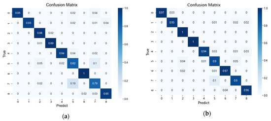 Figure 12a–d show the confusion matrix between the imbalanced dataset A and the rebalanced datasets B, C, and D at a high scale by SVM, which may provide an explanation for the practical effect of using generated data to mitigate the problem of imbalanced data. Figure 12a shows the confusion matrix of the imbalanced dataset A, illustrating that the imbalance of fault categories has a significant negative impact on fault diagnosis. Type-5 and type-7 faults are particularly affected by a category imbalance of only 82% and 79%, respectively. Figure 12b–d demonstrate that the problem of a lack of real fault data can be significantly improved by using the data expansion method. In particular, the MS-PGAN method improves the diagnostic accuracy of type-5 faults from 82% to 90%, and that of type-7 faults from 79% to 90%, achieving remarkable results. Obviously, the proposed method using MS-PGAN for data augmentation has the ability to improve the accuracy of fault diagnosis, especially for those fault categories that are most affected by an imbalance of fault categories.