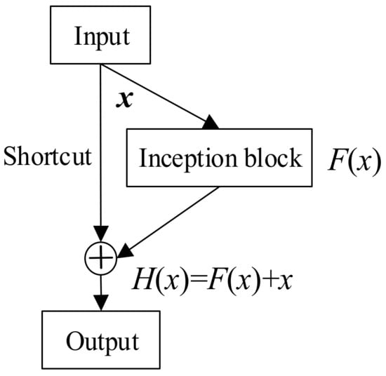 He et al. [28] designed a residual block with a shortcut based on CNN, which facilitated optimization and eliminated the gradient vanishing, gradient explosion, and network degradation associated with increased network depth. Subsequently, Szegedy et al. [29] improved this model when developing the Inception-ResNet network; the basic module is shown in Figure 1. Convolutional layers with kernels of different sizes are concatenated into a single output vector (an inception block) that learns residual information from input . The shortcut adds input to the residual result to enable mapping . The Inception-v4 framework of [29] has three types of inception blocks with diverse convolutional layers that capture information from different dimensions. The shortcut connection retains the advantages of residual networks.