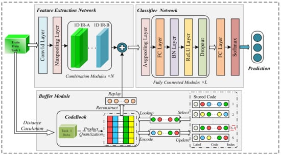 Our novel diagnostic model combines a 1D-Inception-ResNet network with product quantization. The model continuously learns bearing vibration signals under various working conditions and diagnoses faults. The framework of the R-REMIND model is illustrated in Figure 4. The procedure is listed as follows: