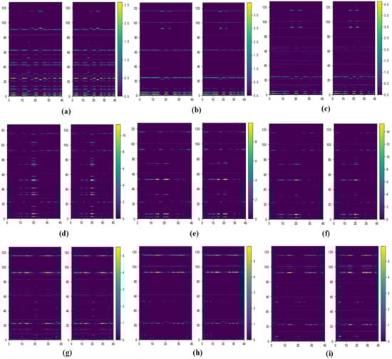 To emphasize the incremental nature of learning from vibration signal features, the output results of the main modules were visualized. The Task 1 output data of the first five 1D IR-A modules (at different stages) are shown in Figure 10. In the first two columns, the change is negligible. The residuals of several 1D IR-A modules are near zero; the model degenerates into a shallow neural network because the learned data are simple. However, in the third column, comparison of (c) and (f) shows that the residual learned by the second 1D IR-A module is no longer near zero when handling complicated data, and the shortcut enhances generalizability.