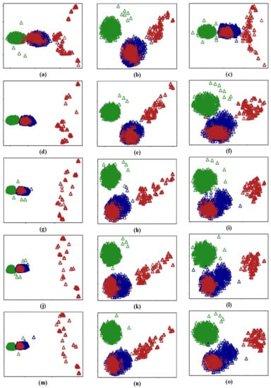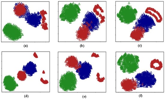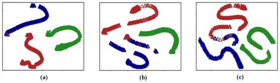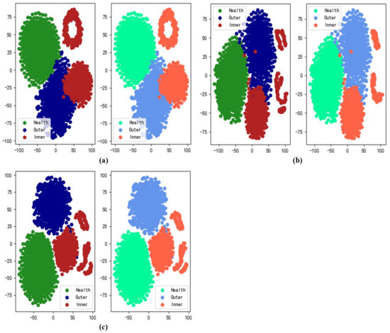 The distributions of task data are shown in Figure 9; the green points are signals from healthy bearings and the blue and red points are signals from inner and outer race faults, respectively. The Task 3 data are more similar to the Task 1 than the Task 2 data, indicating that our method reduces catastrophic forgetting after the Task 3 data have been learned during the continuous process.