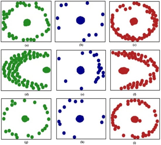 Distributions of task data: (a) healthy data of Task 1, (b) inner fault data of Task 1, (c) outer fault data of Task 1, (d) healthy data of Task 2, (e) inner fault data of Task 2, (f) outer fault data of Task 2, (g) healthy data of Task 3, (h) inner fault data of Task 3, and (i) outer fault data of Task 3.