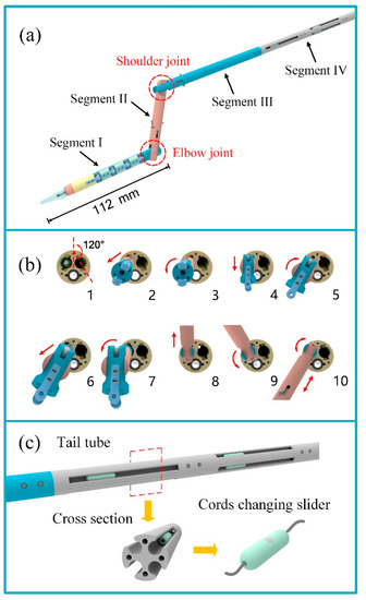 A surgical instrument tube is an executive mechanism that contains a pair of flexible surgical instruments and a laparoscope. The design difficulty of the single-port surgical instrument was to realize the operation of its deployment and recovery, and to ensure its stability and motion accuracy. The designed surgical instrument in this paper was inspired by the structure of the human arm. Based on the segmented structure of the arm, the surgical instrument is divided into four segments (Figure 2a). The first three segments correspond to the hand, forearm, and big arm, respectively, and segment IV is used for the installation of the instrument and cord docking.
