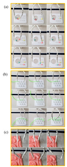 A ball capture test is used to verify the clamping and pulling operation of the surgical forceps, as well as the flexibility and accuracy of the surgical instruments. Before the test, put the base plate on the table, and place a yellow, a pink, and a green ball in the transparent container. First, move the surgical instrument over the transparent container, open the surgical forceps, and grab the yellow ball through the cylindrical hole of the ball. Then, lift the surgical forceps slowly and move them to the bracket attachment on the right side of the base plate. Finally, aim at a bracket, open the surgical forceps, and slide the ball into the bracket. Repeat the above process and put the pink and green balls on the brackets in turn. The experiment process is shown in Figure 11a.