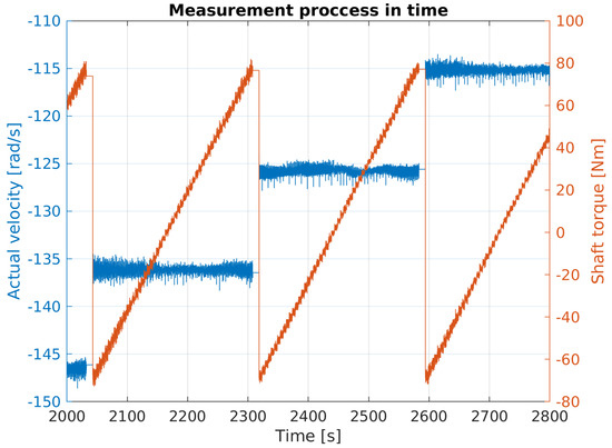 The measurement process was based on an incremental step-change of load torque from negative to positive values during the constant speed operation of DUT, where each step lasted for 5 s. This step-change of load torque was repeated for various speed values, from −2000 rpm to 2000 rpm, with a 100 rpm step. A similar testing profile was used in [10]. The applied testing profile is shown in Figure 2 with a 100 ms sampling time; the figure displays 1000 s from more then 3 h. Using this approach, all speed–torque quadrants were covered with approximately 50 samples, taken in each operating point.