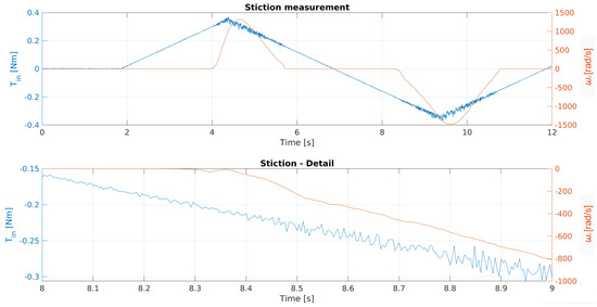 The stiction measurement is performed using a slow torque up–down ramp; the observed values are the motor torque and the rotor speed (Figure 3). The stiction is determined as a value of torque in the instant in which the rotor starts its movement. To obtain an accurate value of the stiction, several points were measured and averaged.