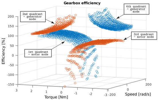 Four-quadrant visualisation of efficiency points of the gearbox, obtained by experimental measurement.