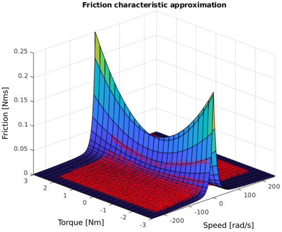 The determined friction characteristic is depicted in Figure 5 from the input (i.e., motor) shaft perspective, where red dots are from the negative speed region (e.g., 2nd and 3rd quadrant) and blue dots belong to the positive speed region (e.g., 1st and 4th quadrant). As can be seen, the friction characteristic does not contain large discontinuities, as was the case in Figure 4 for efficiency. Thus, it is sufficient to divide characteristics into two regions only—one each for positive and negative speed. This is needed for further data processing and mathematical approximations.