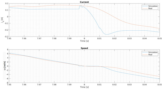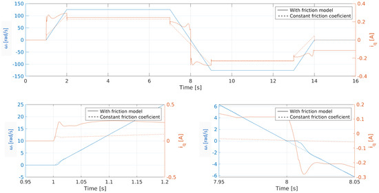 In transition, when the speed changes its direction (at the time s), the stiction effect is observable again. This causes a short steady-state phase with the zero speed, until the torque rises to a higher value, along with the stiction. The simple friction model given by Equation (4) significantly differs in transition, which can be observed in the waveform of the torque-generating current and the speed direction change.