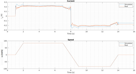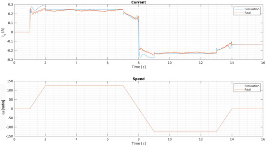 The same movement as in Figure 7 was performed by the actuator on the test bench. Results are compared with the simulation in Figure 8. Again, the torque-generating current and the angular velocity of the motor was observed. No load was applied during the experiment.