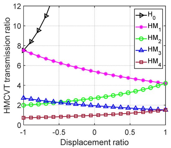 The HMCVT used in this study was designed by the principle of equal ratio. That is, except for the initial working stage (H0 stage), the ratios of the maximum and minimum transmission ratios of HM1~HM4 stages are approximately equal (note: the transmission ratio of HMCVT is defined by the effective working range of the displacement ratio). In this study, the common ratio was 1.81, the maximum transmission ratio of HMCVT was 7.52, and the minimum transmission ratio was 0.72. The design values of transmission system parameters obtained by calculation are shown in Table 1.