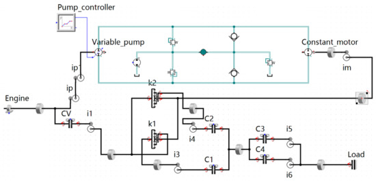 Simulation X has been applied widely in the research on power transmission systems, and its modularized modeling method is applicable to the research objective in this paper. We built a 5-stage HMCVT simulation model (see Figure 3) with the inbuilt variable pump, constant motor model, various types of valve models, planetary gear model, fixed-shaft gear model, and clutch model of the software.