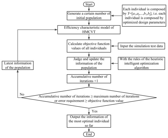 The proposed HMCVT efficiency characteristic piecewise model has many variables to be optimized (see Section 2.5; the three piecewise models have 4, 12, and 14 unknown parameters, respectively). The algorithm’s objective function is nonlinear. The heuristic optimization algorithm plays an important role in solving complicated engineering problems. For example, the research studies in references [25,26,27,28] can be reflected to a certain extent. Considering that the research object has two nonlinear objectives and two sub-models searching the optimum synchronously (which causes relatively more decision variables), we used the genetic algorithm (GA) to solve the unknown parameters in sub-models to build the HMCVT efficiency characteristic piecewise model. To further improve the modeling result of the efficiency characteristic piecewise model, we used the I-GA proposed in previous research and verified for engineering applications [29]. The I-GA improves the convergence rate and precision through the following steps: (1) judging and screening the super individual in the population, (2) adaptive changes of the population size, and (3) adaptive changes of the crossover and mutation probabilities.