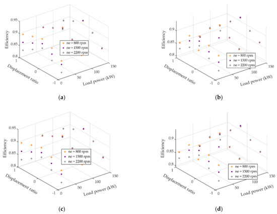 According to reference documents [3,23], the HMCVT’s efficiency characteristics present two significantly different variation laws in different working ranges of the variable pump’s displacement ratio. Specifically, the HMCVT’s efficiency characteristics are significantly different when the displacement ratio is in the ranges of −1~0 and 0~1. It was also supported by the test results of this paper (see Section 3).