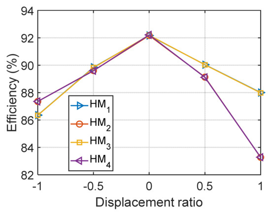 According to Figure 5, Figure 6 and Figure 7 stage HM1 and stage HM3 had similar efficiency characteristics, while stage HM2 and stage HM4 had similar efficiency characteristics. However, stages HM1 and HM3 showed significantly different efficiency characteristics compared with stages HM2 and HM4. Stages HM1 and HM3 showed relatively low efficiency when the displacement ratio was smaller than 0, while stages HM2 and HM4 showed opposite efficiency characteristics (i.e., the two stages showed relatively low efficiency when the displacement ratio was bigger than 0).