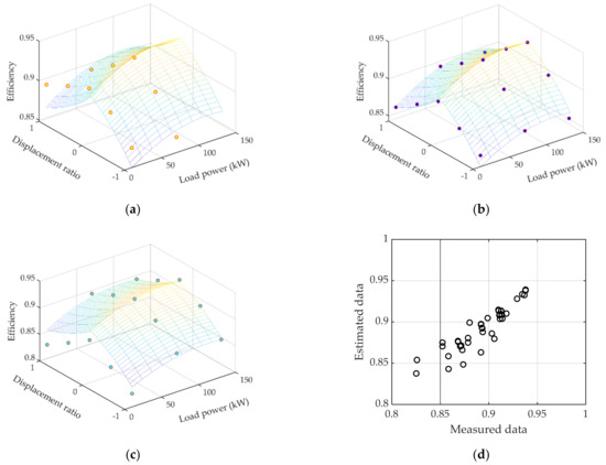 On this basis, we used the form of a piecewise function (with the displacement ratio in the ranges of −1~0 and 0~1, respectively) to build the HMCVT efficiency characteristic model. Because the variation laws of efficiency characteristics had some similarity in the two ranges (see Section 3), for the convenience of HMCVT efficiency characteristic model’s modeling and applications, we used the same form of the model to describe two kinds of characteristics in the two ranges.