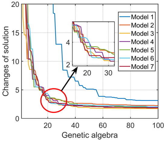 According to Figure 9, the estimated value of model 3 (modified two-factor model with the first-order term of engine speed) was highly consistent with the measured value. Specifically, the measured and estimated values of the 40 groups of data were distributed along a diagonal line as shown in Figure 9d. This shows two aspects: (1) introducing the first-order term of engine speed to modify the original two-factor model could effectively improve the accuracy of the original two-factor model, the R2 increased by 9.29% and MAPE increased by 7.70%. (2) The I-GA algorithm was effective in parameter identification of the model. In the identification process of Model 3, the algorithm objective function finally converged to 1.6884 (this value is the mean absolute percentage error between the measured value and the estimated value). The iterative evolution curves of the I-GA (7 models) are shown in Figure 10.