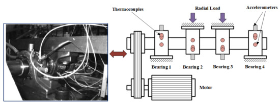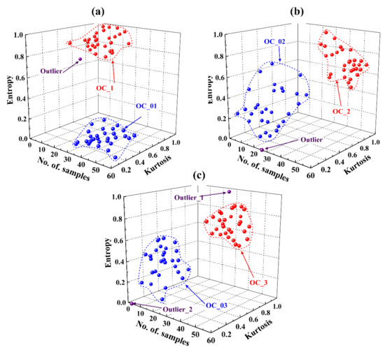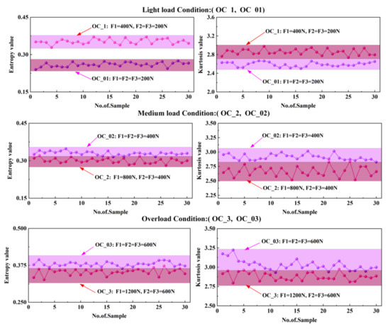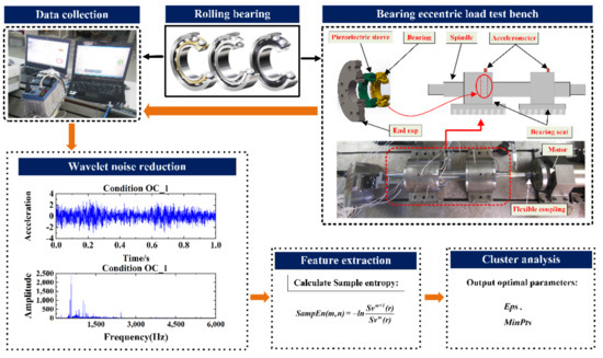The extraction of early faint fault characteristics from rolling bearings has progressed significantly over the last few years [13,14,15,16]. Scholars have made improvements on traditional feature extraction algorithms. Castellani et al. first extracted the RMS, skewness, kurtosis, crest factor, and peak value of the preprocessed acceleration signal, analyzed the damage detection ability of a single feature using ANOVA, and realized the data visualization using PCA. Finally, the target is distinguished from the reference wind turbine using a novelty metric based on Mahalanobis distance [17]. Kurtosis, a statistical measure of the distribution of random variables, is increasingly being employed in the detection of bearing cracks. Time domain kurtosis of the wheel bearing vibration signal and the fault frequency were used as feature vectors for spectral kurtosis analysis by Chen Bin et al. [18]. Rohani Bastami and Bashari proposed a wavelet-based impulse response method for damped single-degree-of-freedom systems, and then found the optimal damping ratio by maximizing the ratio of the peak of spectral kurtosis (SK) to the mean value of SK. Finally, the method is applied to the simulated vibration signal of the defective REB and the experimental vibration signal of the defective REB. The results show that the method outperforms the SK calculation based on STFT and Morlet wavelet in detecting the resonance band of the vibration signal [19]. Bearing fracture classification under varied flaws was then completed using a support vector machine (SVM). Bearing degradation can be detected by analyzing SK and correlation coefficients, which can detect early faults in the presence of concealed noise and pinpoint their location by Tian Jing et al. [20]. Zhong et al. improved the calculation method of kurtosis and negative entropy, and proposed an index based on weighted residual regression, thereby reducing the sensitivity of kurtosis and entropy to impulse noise. Finally, it is verified in gear and bearing degradation evaluation, and the results show that the improved state index has better early fault detection ability and monotonic trend ability [21]. It is worth noting that entropy algorithms quantify the complexity of data, making them useful for a wide range of structural health monitoring and defect identification tasks [22,23]. Sandoval et al. used multiple entropy indexes to represent bearing vibration signals under different health conditions and compared them with conventional indexes. The results show that entropy indexes (EIs) can more accurately distinguish damaged bearings of low-speed bearings. Furthermore, the results show that the combination of conventional metrics and entropy-based metrics also contributes to more reliable diagnosis [24]. Without knowing where the data for the target series came from, sample entropy (SE) is applied in order to assess its randomness [25]. In the realm of bearing condition monitoring and problem diagnostics, certain applications have thus been found [26,27]. Support vector machines were used to classify the LMD, sample entropy, and energy ratio values that Han provided as a diagnostic technique [26]. Wang used generalized refined combined multiscale sample entropy to extract fault features and supervised isometric mapping to reduce dimensionality before employing support vector machines (GOS-SVM) and grasshopper optimization algorithms to finish the diagnosis of rolling bearing faults [27]. Researchers, on the other hand, found that the most obvious types of bearing cracks, such as inner ring, outer ring, and rolling element faults, could be extracted using feature extraction. This method may not be able to accurately detect a bearing’s operating state when the bearings do not have problems but are an unbalanced load because of improper assembly and other issues. When dividing raw data at different scales, scale factors must be considered, and the division effect tends to be unpredictable as the data length grows. As a result, the kurtosis and entropy values of the vibration signal are studied in this work as state characteristics of the bearing under imbalanced loading conditions. As a result, determining the condition of the bearings at various levels of misalignment is a problem.