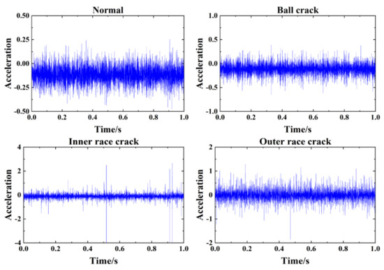 To validate the approach described in this paper’s practicality and accuracy, experimental validation of the bearing’s vibration state for each failure mode was performed. Using a double row bearing as an example, failure data was gathered from the University of Cincinnati’s Intelligent Maintenance System (IMS) bearing testing bench; the test bench’s exact structural components are depicted in Figure 4. A motor, four bearings, accelerometers, and other components comprise the bench. The bearing is a Rexnord ZA−2115 double row bearing with a sampling rate of 20 kHz, a sampling period of 1 s per sample, and a speed of 2000 r/min. Three data sets were obtained throughout the operating process, with bearing 3 in data set 1 exhibiting an inner ring crack, bearing 4 exhibiting a ball crack, and bearing 1 exhibiting a normal bearing; bearing 3 in data set 3 exhibiting an outer ring crack. The data collected in this article is representative of four distinct operating conditions: normal bearing operation, inner ring failure, rolling element failure, and outer ring failure. The sorts of defects that can occur during bearing operation are listed in Table 1.