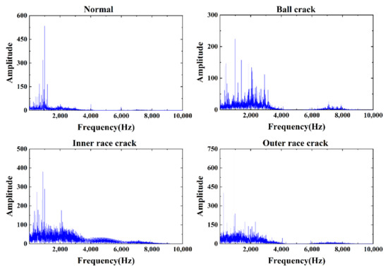 For each condition, the vibration data is retrieved within 1 s and examined in the temporal and frequency domains. In order to improve discrimination, the time domain signal was first subjected to the wavelet transform for noise reduction, and the result of the third layer wavelet transform was used to represent the vibration signal (Figure 5 and Figure 6). When a bearing has a ball crack, an inner ring crack and an outer ring break can be seen in these waveforms in time and frequency. Because the bearing rotates at a specific frequency, the amplitude difference seen in the graph in the low frequency region is less pronounced. However, the amplitude difference in the high frequency band appears to be larger, and the distribution is extremely intense due to the different types of faults. This paper uses a feature extraction method based on kurtosis and sample entropy to process the vibration signal after noise reduction in order to better distinguish the bearing crack type because it is difficult to distinguish the rolling bearing working state from time and frequency domain waveforms.
