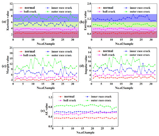 Feature distribution diagram of IMS bearing under various working conditions: (a) Sample entropy value, (b) Kurtosis value, (c) Margin value, (d) Impulse value, (e) AE value.