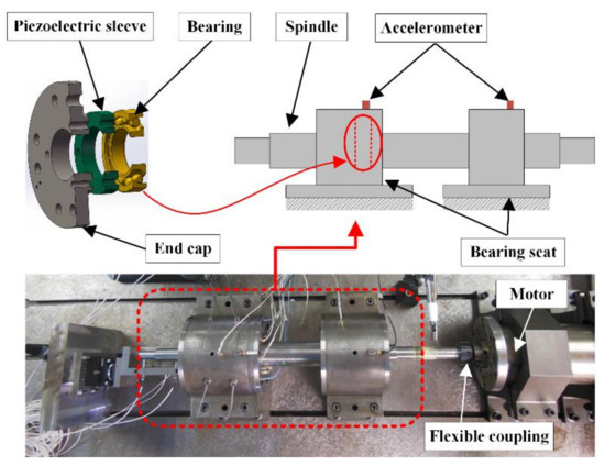 An unbalanced bearing load test bench was developed and constructed in this manuscript to further examine the monitoring function of the suggested technique during biased bearing operation, as seen in Figure 10. The test bench primarily consists of a motor, a precision spindle, a rolling bearing, and an acceleration sensor, with the electric spindle reaching a maximum speed of 10,000 r/min. The mechanical spindle is coupled to the electric spindle by a flexible coupling, and the motor operation is controlled via the servo control system.