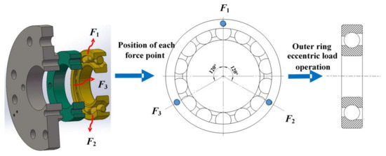 Four NSK7014C angular contact ball bearings were employed in this test bench. Figure 11 illustrates the bearing structure loaded schematic diagram, where F1, F2, and F3 are loaded on the bearing at 120°, respectively, and the bearing bias running state is defined by setting different sizes of preload; the bearings are mounted back-to-back, the fixed speed is 4000 r/min, the sampling frequency is 8192 Hz, and the sampling length is 512. Table 2 shows the bearing parameters.