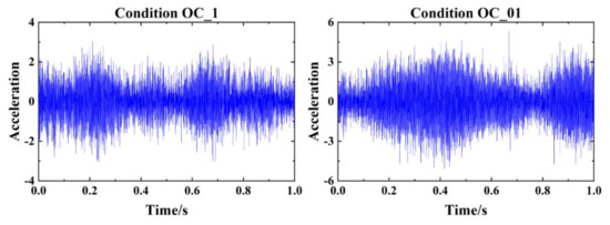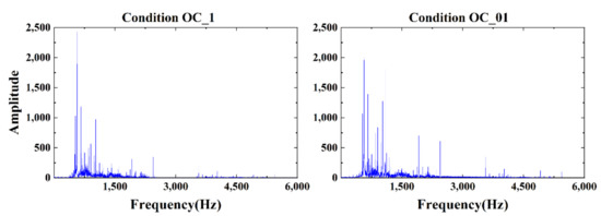 Similarly, vibration signals within one second were extracted for analysis, wavelet noise reduction was performed to the extracted vibration signals, and the resulting time and frequency domain waveforms were shown. The time domain waveform of the bearing under load after wavelet noise reduction is shown in Figure 12. As seen in the picture, the amplitude of the periodic variation in operating state OC_1 is greater than that in state OC_01, while the amplitude of the acceleration is smaller. The time domain waveform reveals the change in operational condition intuitively. The frequency domain waveform of the bearing loaded after wavelet noise reduction is shown in Figure 13. As shown in the figure, the low frequency band part has a relatively small difference in amplitude because the bearing has a fixed rotation frequency, but the high frequency band has a noticeable difference in amplitude because the bearing is loaded differently. In order to better distinguish the bearing crack type, the algorithm developed in this paper is used to analyze and process the data.