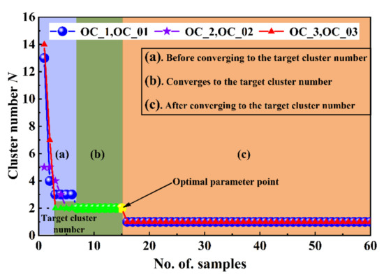 The feature vectors from Section 3.2 are used to build the data set , and the IDBSCAN algorithm from Section 2.2 is used to identify the parameters of the features, resulting in a list of Eps, MinPts variables. Finally, the number of clusters corresponding to each set of parameters is estimated. Figure 8 shows the relationship between the number of clusters and the number of samples, with the three intervals (a), (b), and (c) indicating convergence before, convergence to, and convergence after the target number of clusters, respectively.