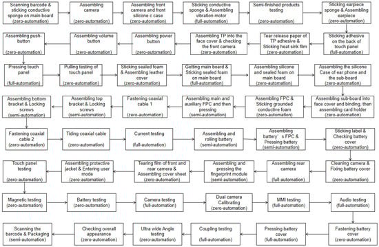 Mobile phone products have similar assembly processes due to their similar basic structures. Among them, the process that can meet the basic assembly demand for general mobile phone products can be called a common process. The process that can only meet the personalized demand for specific mobile phone products is called the individual process. The assembly processes are an essential basis for assembly line design. For general mobile phone products, the assembly process is shown in Figure 1.