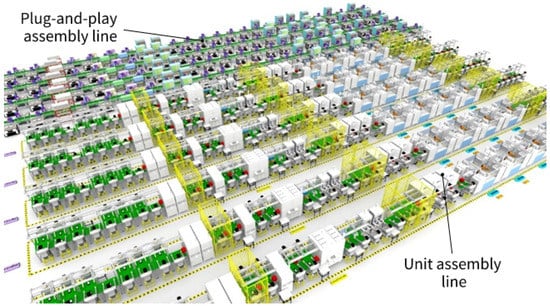 Table 1 shows that the annual working time of the workshop is 312 days. By considering all kinds of holidays, the actual working time is about 300 days and the actual effective working hours of the workshop are 13 h per day. The daily production capacity needs to reach 33,334 units to meet the design demand. The target capacity is 200 units per hour for the plug-and-play assembly line and 300 units per hour for the unit assembly line. If the plug-and-play assembly lines alone were used to configure the workshop, it would require 13 assembly lines with a capacity of about 2600 units per day. Equation (1) shows that the target production takt of the assembly line is 18 s. If only the unit assembly lines were used, it would require nine assembly lines with a capacity of about 3900 units per day and the target production takt of the assembly line is 13 s.
