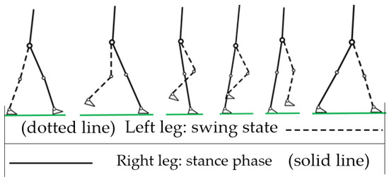 The human gait. The dotted line represents the left leg in the swing state, the solid line represents the right leg in the stance phase.