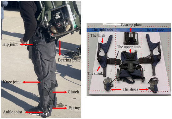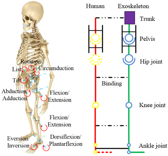 Exoskeletons are mechanical and electrical devices that are worn by an operator and are designed to increase the body’s physical performance. The development of an exoskeleton robot involves many fields [1], including military [2], medical [3], industry [4], and has formed many types of products and prototypes such as Stride Management Assist (SMA) and ankle foot orthoses (AFO) [5,6]. As a kind of technical equipment combined with the human body, the exoskeleton robot and the human body are connected by the body–exoskeleton binding, which ensures the two move synchronously and constructs the human–exoskeleton integrated system. Obviously, one of the keys to realizing the assistance effect of an exoskeleton robot was to study the coupled relation of body–exoskeleton systems [7].