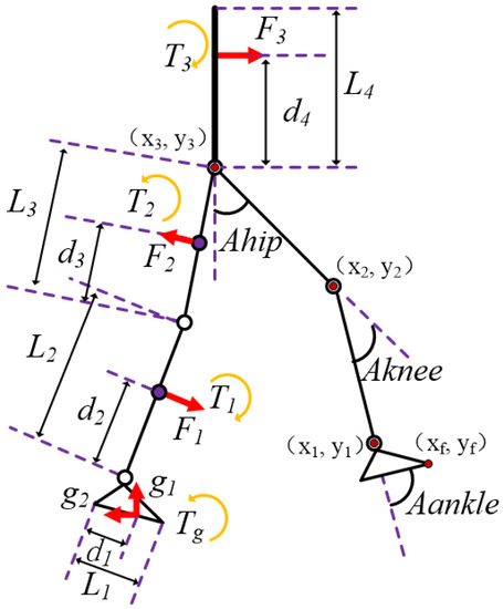 where , corresponding to the force and torque of the ankle, knee, hip and trunk of the human and exoskeleton in the sagittal plane, and it was necessary to make these joint internal forces and torques compatible, i.e., . Meanwhile, the upper limb of the exoskeleton and human trunk was set as a fixed connection, and its dynamic problem could be equivalent to the analysis of static balance.