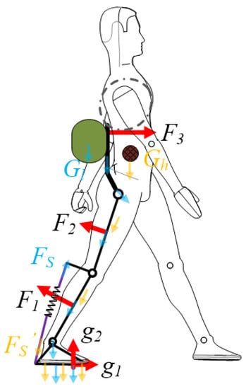 In the body–exoskeleton integrated system, there were two force systems that were not directly related, including of load weight and human gravity. Human gravity was the main object of external energy consumption of human walking. The load weight was supported by the exoskeleton, and the exoskeleton preliminarily realized the redistribution of load weight compared with that when the load was directly carried by the human. Here, it was considered to combine human gravity and load weight to realize the redistribution of the body–exoskeleton interaction force. The workspace of human gravity was located in the shoes of the exoskeleton, and an elastic element was embedded in the lower leg of the exoskeleton. Its basic mechanism was as follows.