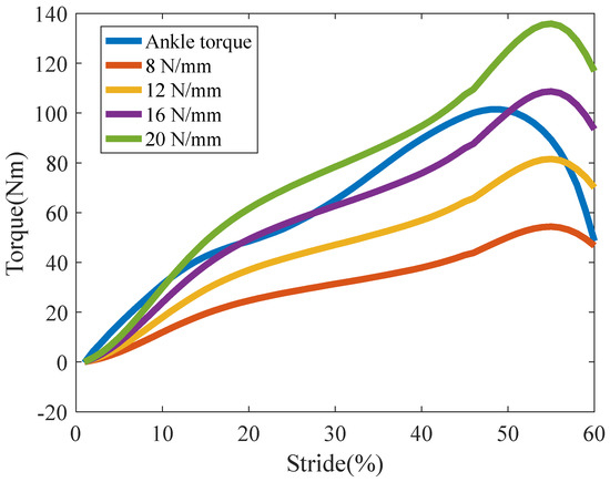 Based on the principal analysis of the body–exoskeleton interaction force, we proposed using elastic elements combined with the characteristics of human gait to reduce the output of human power during walking with the passive exoskeleton. Here, according to Formula (4) and the clinical gait data [38], we could obtain the ankle torque of the passive exoskeleton and the spring torque for different exoskeleton spring stiffnesses; the results are shown in Figure 5.