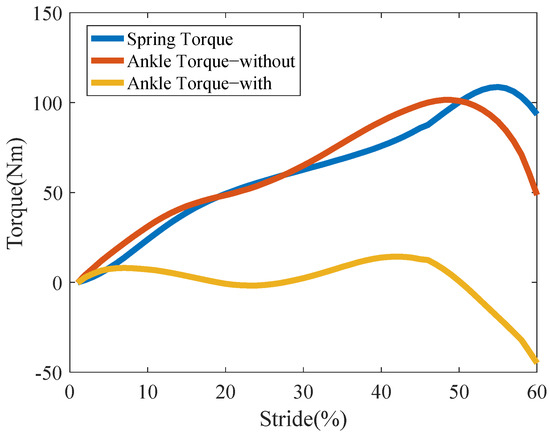 During the passive exoskeleton walking with load, the movement of the exoskeleton ankle in the stance phase was maintained by the load torque, spring torque and the driving torque of the human. In Figure 6, using the heel touching the ground as the starting point of a gait cycle, the deformation of the spring and its torque increased. Because the spring torque offset part of the load torque, the required ankle torque decreased, which reduced the burden of the driving force of the human ankle. At the end of the stance phase, the elastic potential energy stored by the spring assisted the ankle plantar flexion and reduced the propulsion of the human ankle. Using the simulation results in Figure 6, the body–exoskeleton interaction force under the action of the spring reduced by 98.5% with spring compared to without spring, which preliminarily verified the effectiveness of this mode in theory.