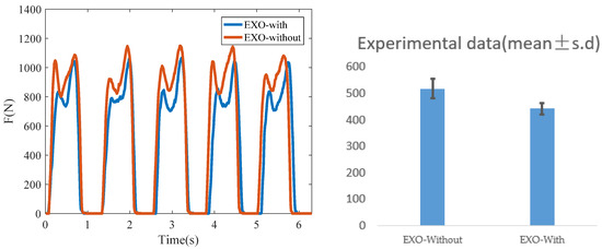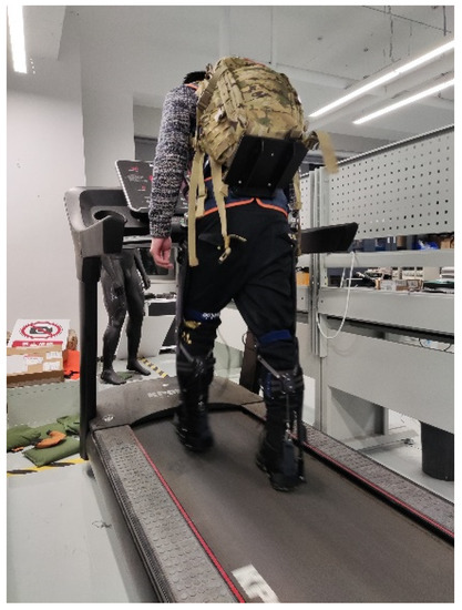 Based on the simulation results, the body–exoskeleton interaction force was significantly improved by our own design. However, it was affected by the matching degree between exoskeleton and wearer, load size, walking speed and other factors in practice. In order to test the actual effect of improving the body–exoskeleton interaction force, this paper completed the test experiment of seven wearers (N = 7; age = 26.5 ± 0.98 years; mass = 78.3 ± 1.6 kg; height = 1.75 ± 0.138 m) walking with the exoskeleton and carrying a weight of 30 kg at 4 km/h walking speed on a treadmill (See Figure 8). In order to obtain the body–exoskeleton interaction force and plantar pressure data of the tester, we used the Pedar-x (a wireless plantar pressure test device, Novel, Munich, Germany) to get these experimental data. The experiment was approved by the Ethics Committee of Beijing institute of technology (BIT-EC-H-2021118).